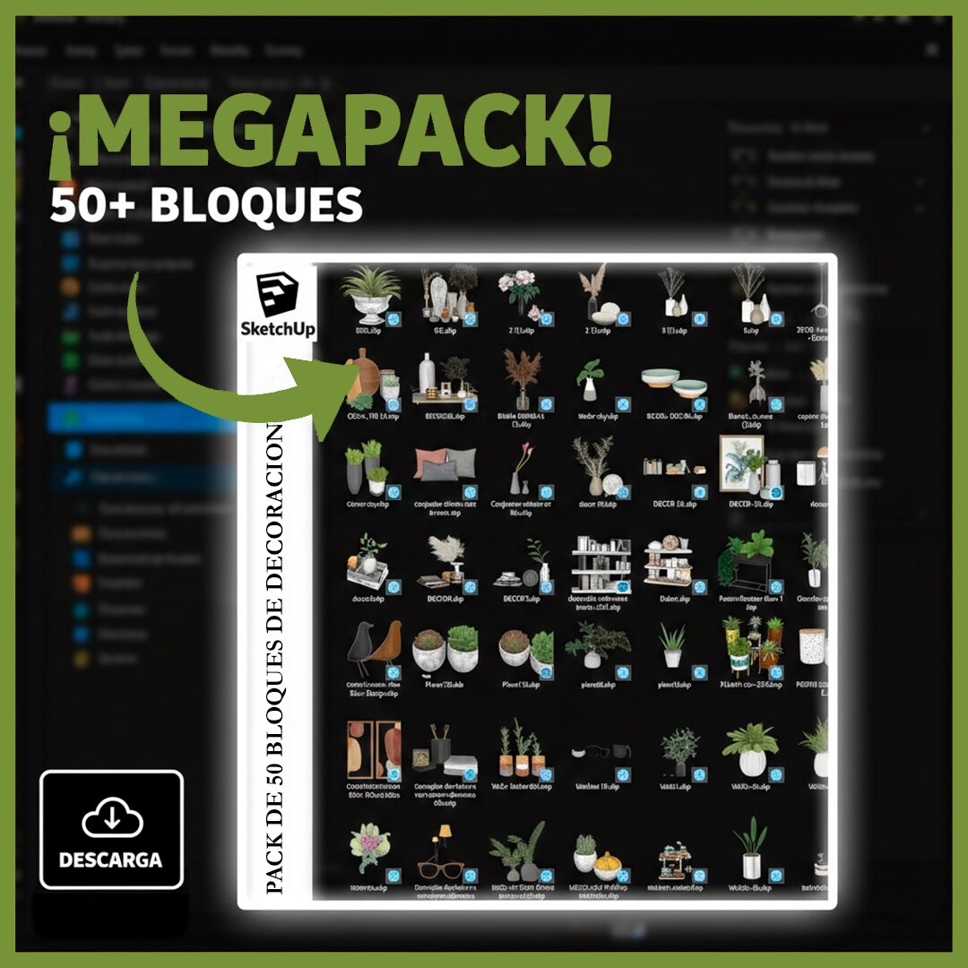Ahorre horas de modelado y mejore el realismo de sus interiores con esta colección exclusiva de más de 50 bloques para SketchUp. El pack incluye mobiliario moderno, decoración detallada y vegetación interior lista para usar. Archivos en formato .SKP, totalmente editables y optimizados para no saturar sus escenas.